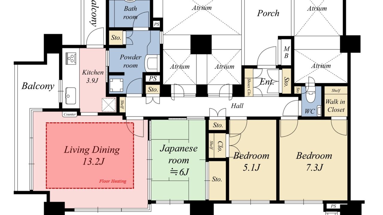- 88.42㎡(壁芯)/バルコニー:33.57㎡