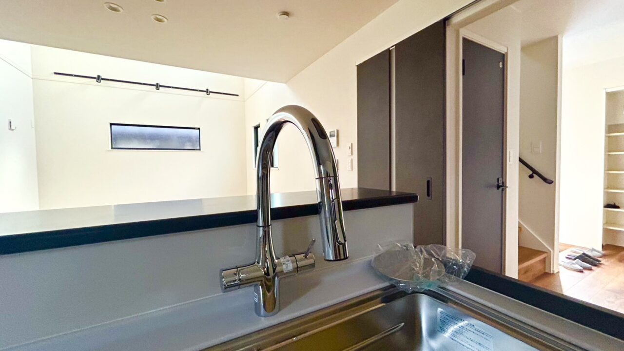 タッチレス水栓実装!吹き抜け上部の窓から青空!北西角地の新築戸建て。耐震等級3