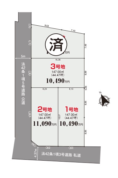| その他法令上の制限 | 接道状況 | 南側 4.37m 私道(法42条1項3号) 、西側 4.37m 公道(法42条1項5号) | |