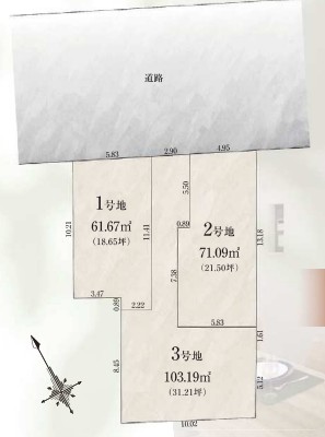 - 1号地:61.67㎡、 2号地:71.09㎡、 3号地:103.19㎡